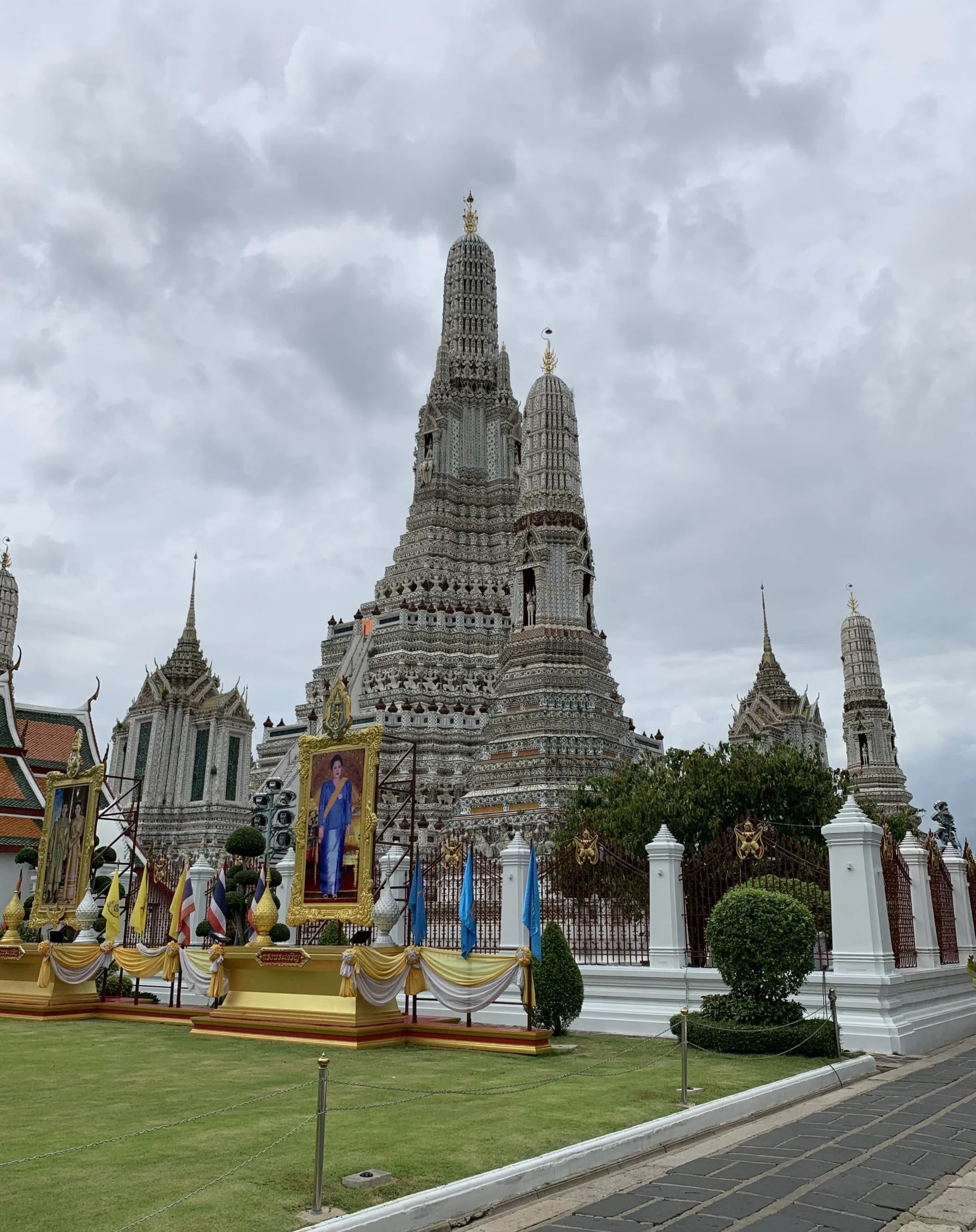 Wat Arun has two central spires that are decorated with multicolored ceramics.